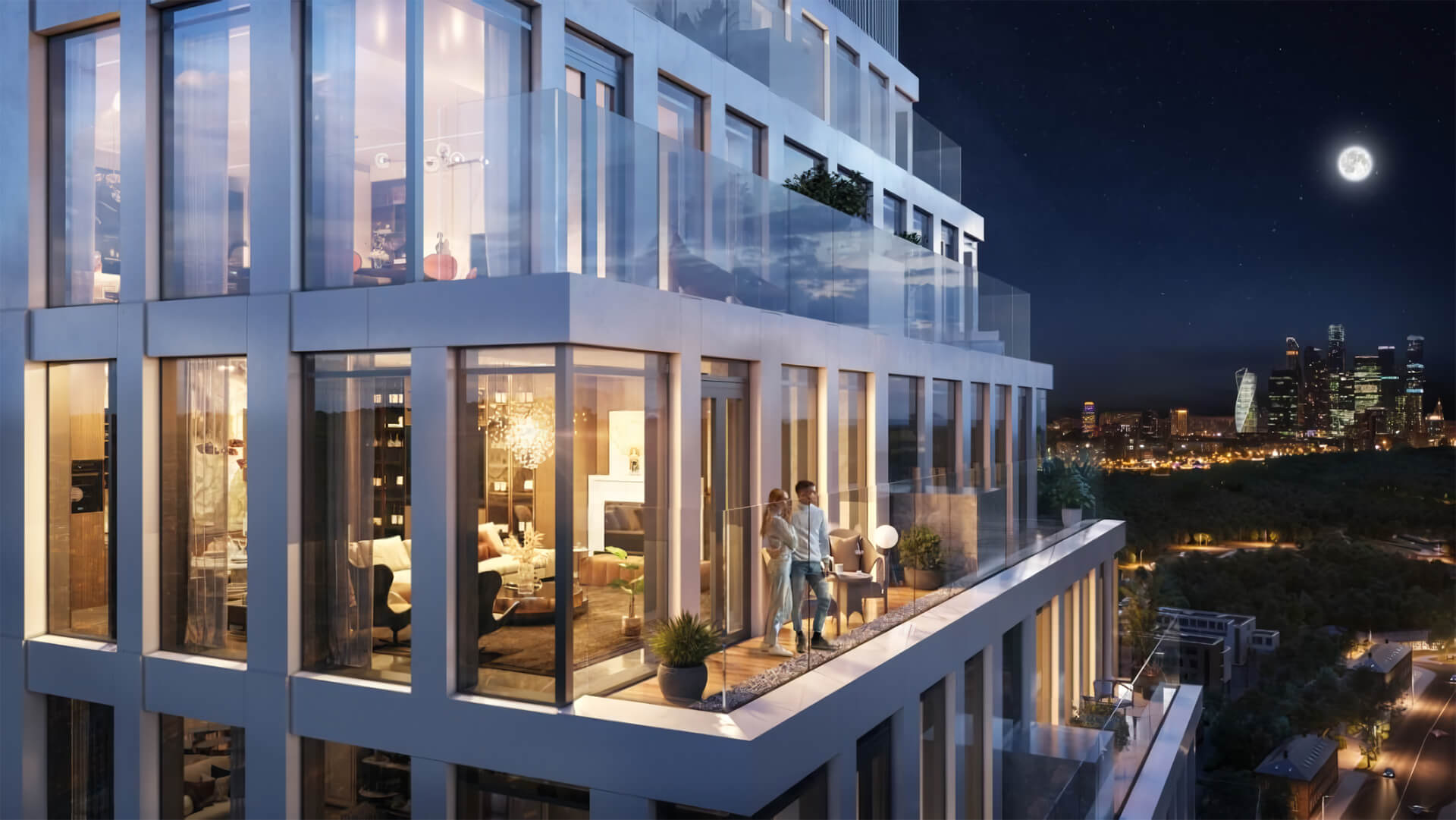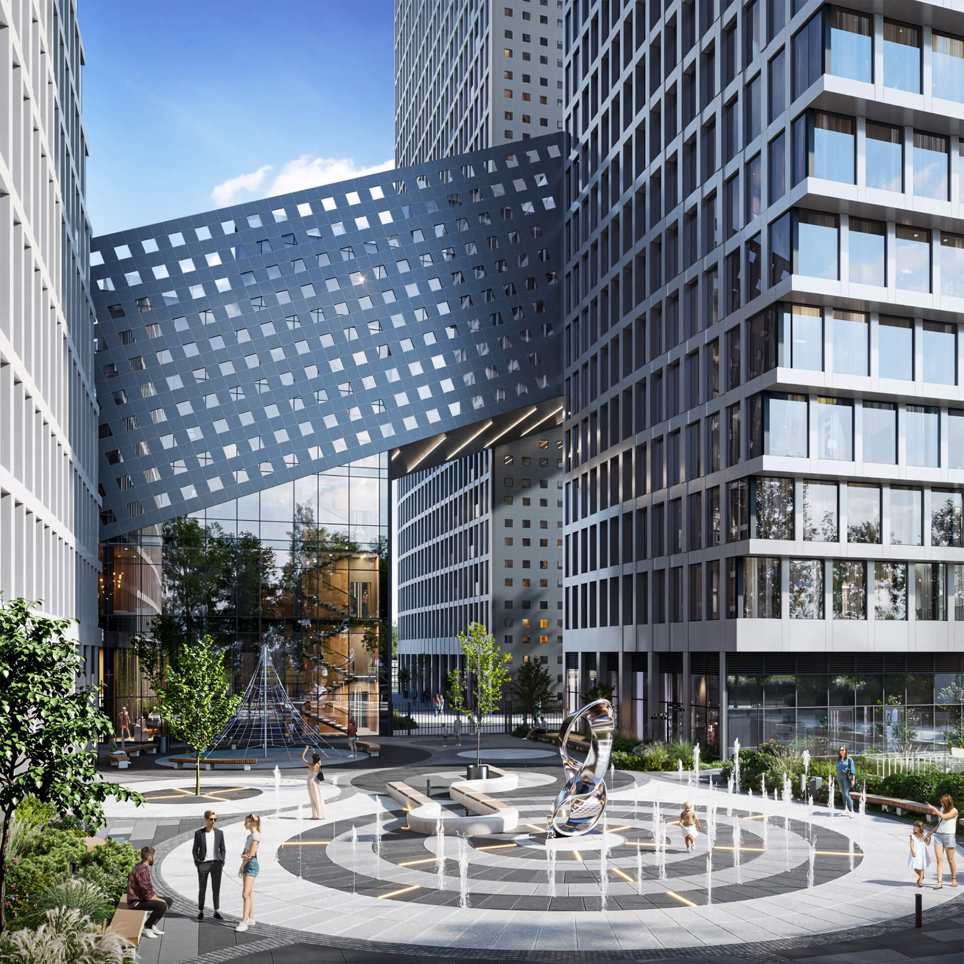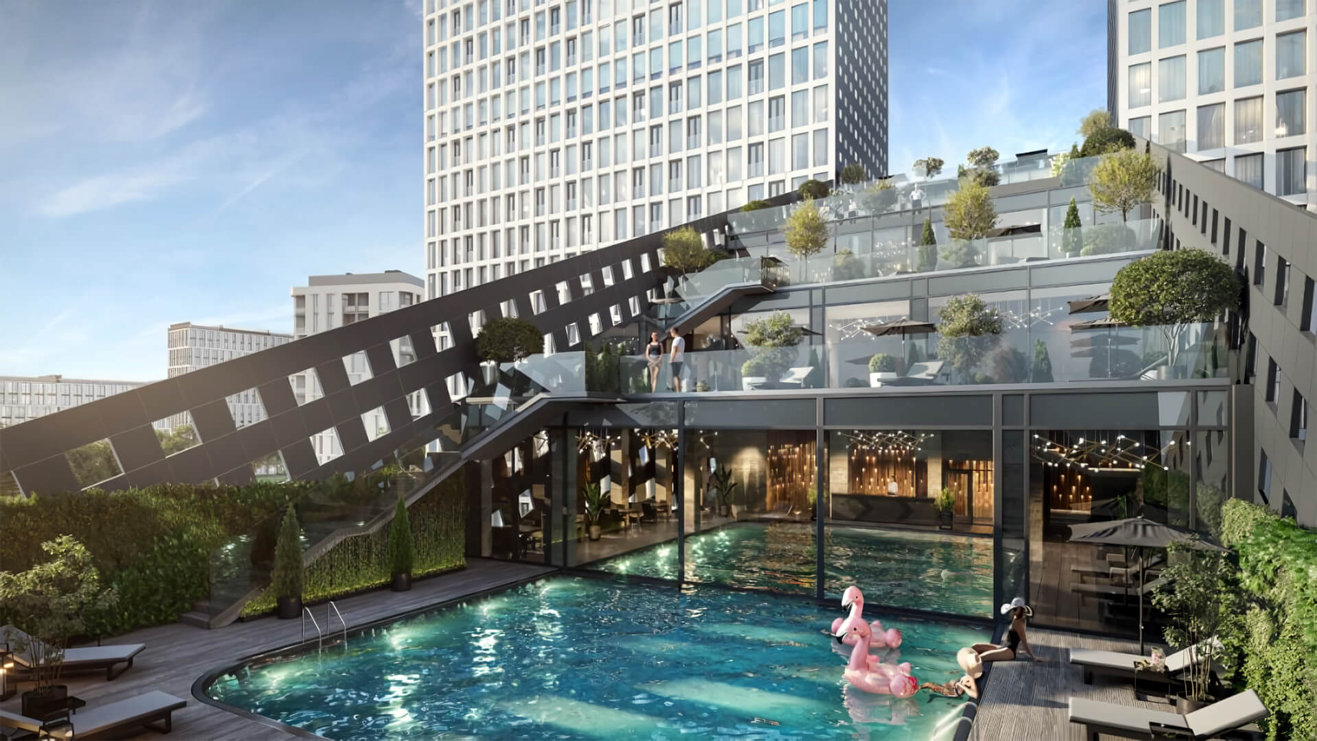 Четыре корпуса с футуристическим дизайном создают уникальную атмосферу, интегрируя просторные апартаменты, SPA-центр с открытым бассейном, офисный центр, супермаркет, кафе и зоны для приватного отдыха. В комплексе представлены разнообразные форматы жилья: от студий площадью 18 м² до просторных четырехкомнатных апартаментов 155 м² с террасами и панорамными видами.