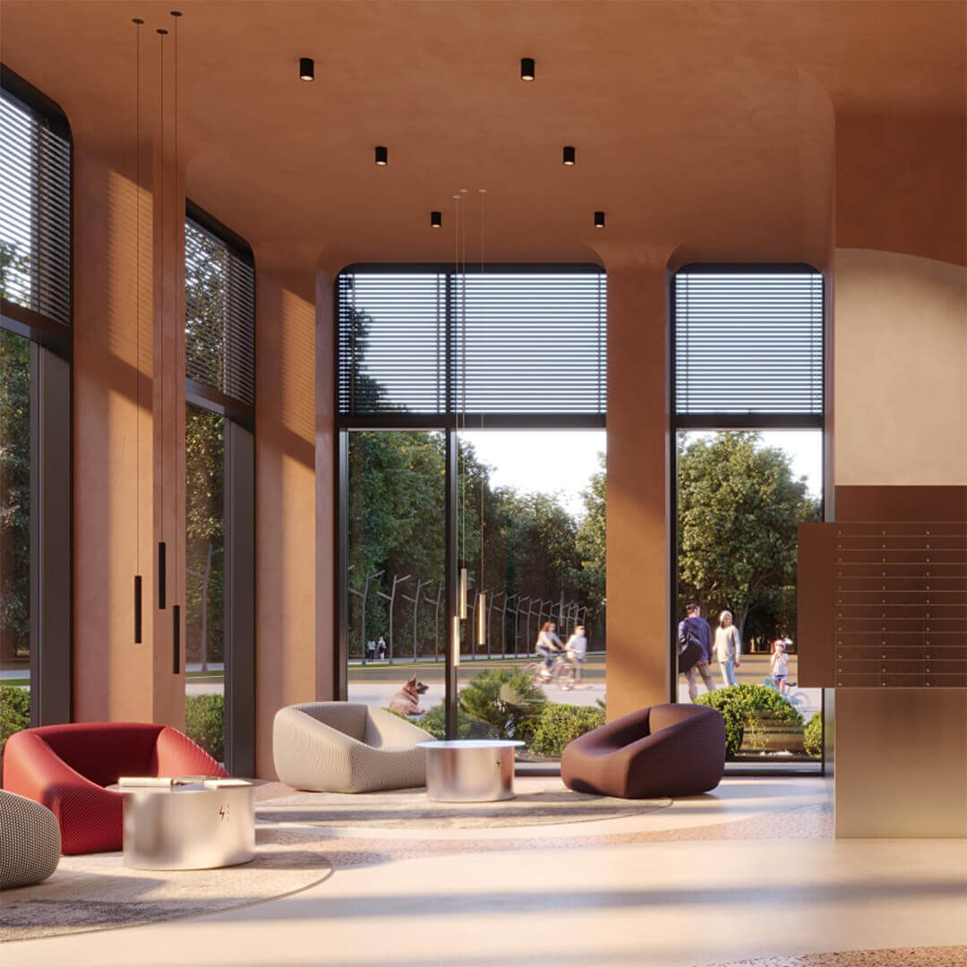 Лобби оборудованы зонами отдыха, колясочными, игровыми комнатами и пространствами для работы. Бесшумные лифты и круглосуточный консьерж-сервис обеспечивают высокий уровень удобства. Здесь каждая деталь продумана для комфорта жителей.