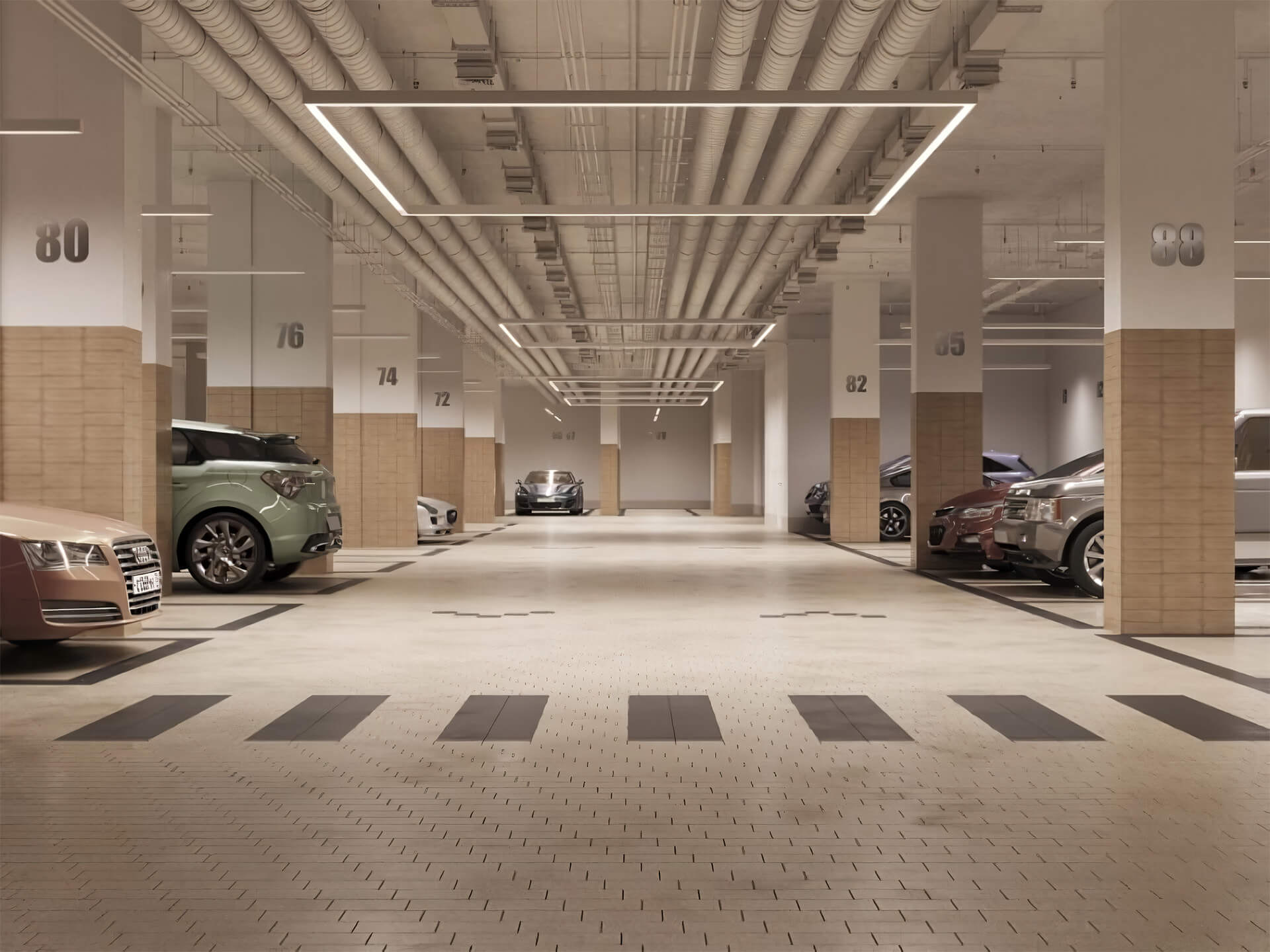 Паркинг оснащен современными системами безопасности, продуманной навигацией и комфортными парковочными местами. Мягкое освещение и стильное оформление делают пространство не только функциональным, но и эстетически приятным.